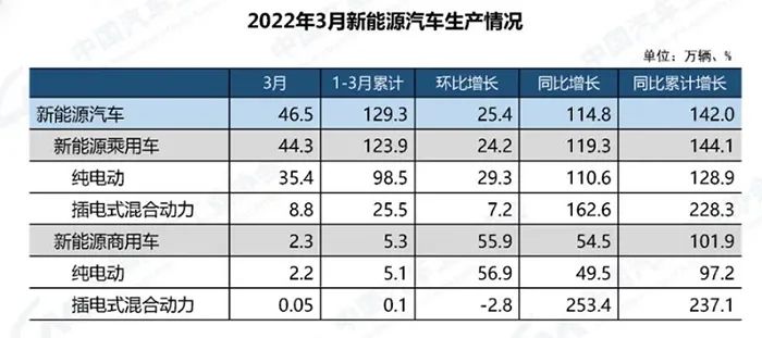 從新能源汽車(chē)產(chǎn)業(yè)的產(chǎn)銷(xiāo)數(shù)據(jù)來(lái)看,2022年3月,新能源汽車(chē)生產(chǎn)完成46.5萬(wàn)輛,同比增長(zhǎng)1.15倍。其中純電動(dòng)乘用車(chē)生產(chǎn)35.4萬(wàn)輛,同比增長(zhǎng)110.6%;插電式混合動(dòng)力乘用車(chē)生產(chǎn)8.8萬(wàn)輛,環(huán)比增長(zhǎng)7.2%;純電動(dòng)商用車(chē)生產(chǎn)2.2萬(wàn)輛,同比增長(zhǎng)49.5%;插電式混合動(dòng)力商用車(chē)生產(chǎn)0.05萬(wàn)輛,同比增長(zhǎng)253.4%。