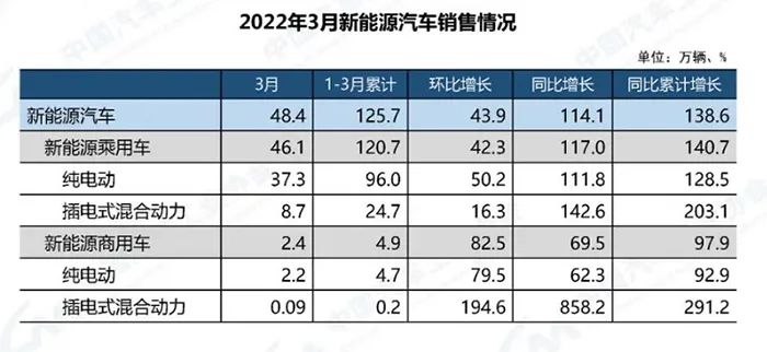 3月,新能源汽車(chē)銷(xiāo)售完成48.4萬(wàn)輛,同比增長(zhǎng)1.14倍。其中純電動(dòng)乘用車(chē)銷(xiāo)售完成37.3萬(wàn)輛,同比增長(zhǎng)111.8%;插電式混合動(dòng)力乘用車(chē)銷(xiāo)售完成8.7萬(wàn)輛,同比增長(zhǎng)142.6%;純電動(dòng)商用車(chē)銷(xiāo)售完成2.2萬(wàn)輛,同比增長(zhǎng)62.3%;插電式混合動(dòng)力商用車(chē)銷(xiāo)售完成0.09萬(wàn)輛,同比增長(zhǎng)858.2%。