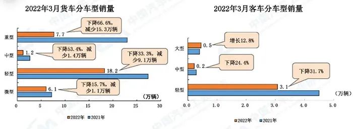 從細(xì)分車(chē)型來(lái)看,2022年3月,商用車(chē)產(chǎn)銷(xiāo)分別完成36萬(wàn)輛和37萬(wàn)輛,同比分別下降38%和43.5%。其中,3月重型貨車(chē)銷(xiāo)7.7萬(wàn)輛,中型貨車(chē)銷(xiāo)1.2萬(wàn)輛,輕型貨車(chē)銷(xiāo)18.2萬(wàn)輛,微型貨車(chē)銷(xiāo)6.1萬(wàn)輛。四類貨車(chē)同比呈不同程度下降,重型貨車(chē)降幅最為明顯,同比下降66.6%。