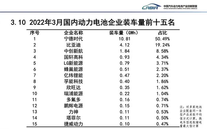 2022年1-3月國(guó)內(nèi)動(dòng)力電池企業(yè)裝車(chē)量前十名分別是:寧德時(shí)代、比亞迪、中創(chuàng)新航、國(guó)軒高科、蜂巢能源、LG能源、億緯鋰能、孚能科技、欣旺達(dá)、捷威動(dòng)力。