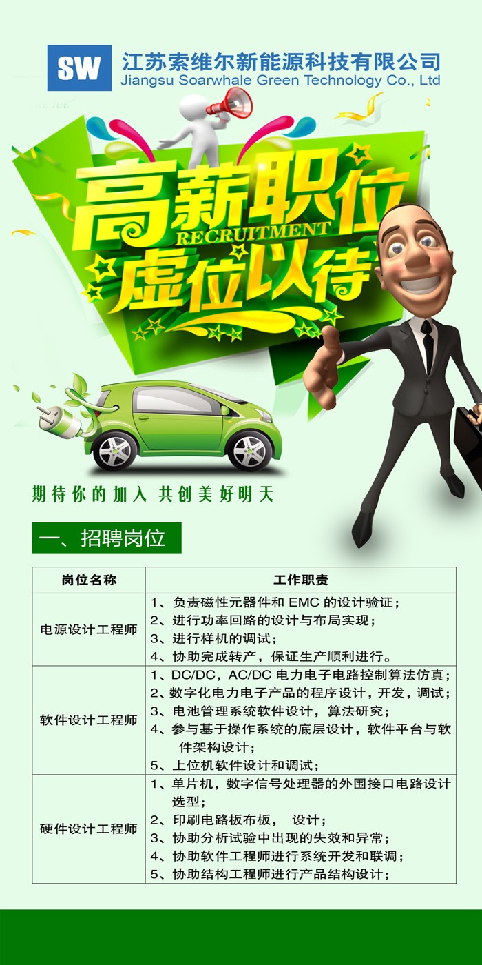 3月上旬,索維爾全資子公司——上海藍驅新能源科技有限公司啟動2017春季校招工作,走進同濟、上海理工、浙大、復旦等知名院校開展校園宣講和招聘活動。主要招聘崗位是電源設計工程師、軟件設計工程師和硬件設計工程師。